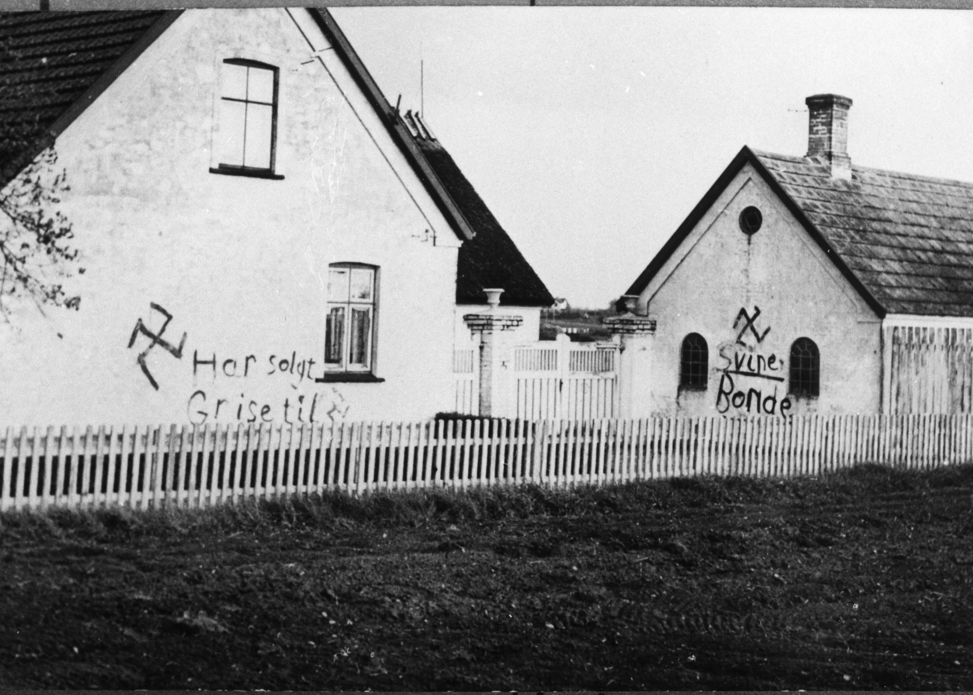 Gård nær Græsted, hvor ejeren solgte grise til tyskerne, overmalet med hagekors og ordene ”Svine Bonde”.