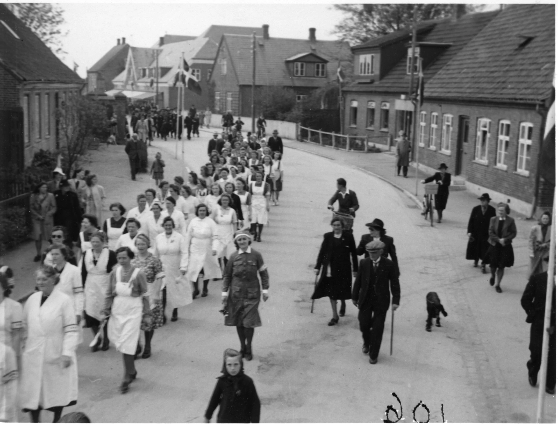 May 8th became known as VE Day (Victory in Europe). In Helsinge, the day was celebrated with a parade where freedom fighters from Helsinge and surrounding towns marched through the streets. The parade started from the sports field at the end of Idrætsvej and ended in Præstegårdshaven, where tables and benches were set up.
