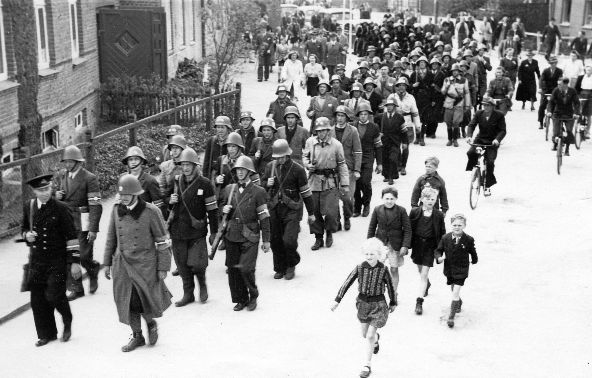 Resistance fighters on Vestergade in a joint march towards Præstegårdshaven