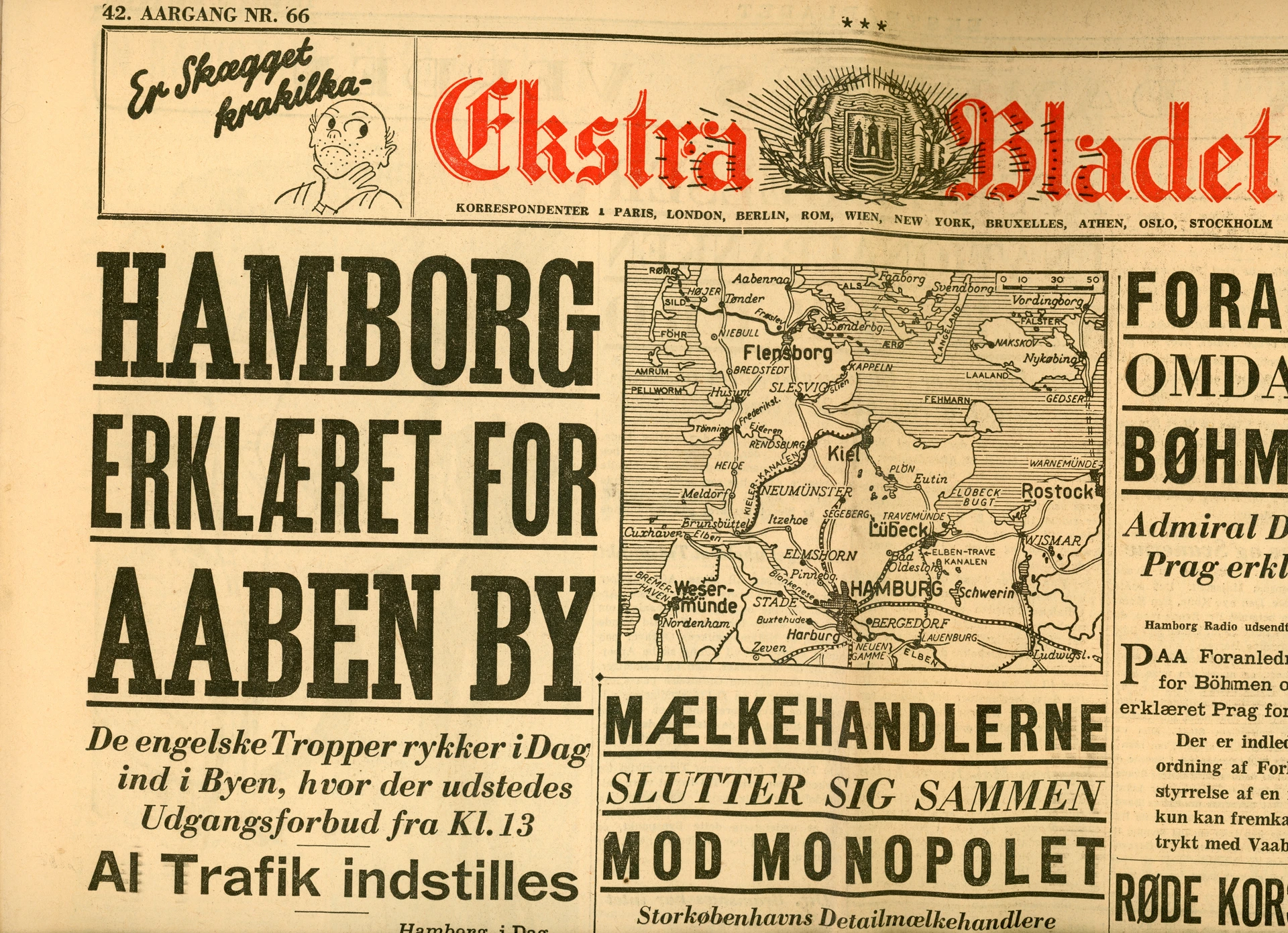 EN: Russian soldiers raise the Red Flag over the Reichstag in Berlin, May 2, 1945. Front page of Ekstra Bladet from May 3, 1945.