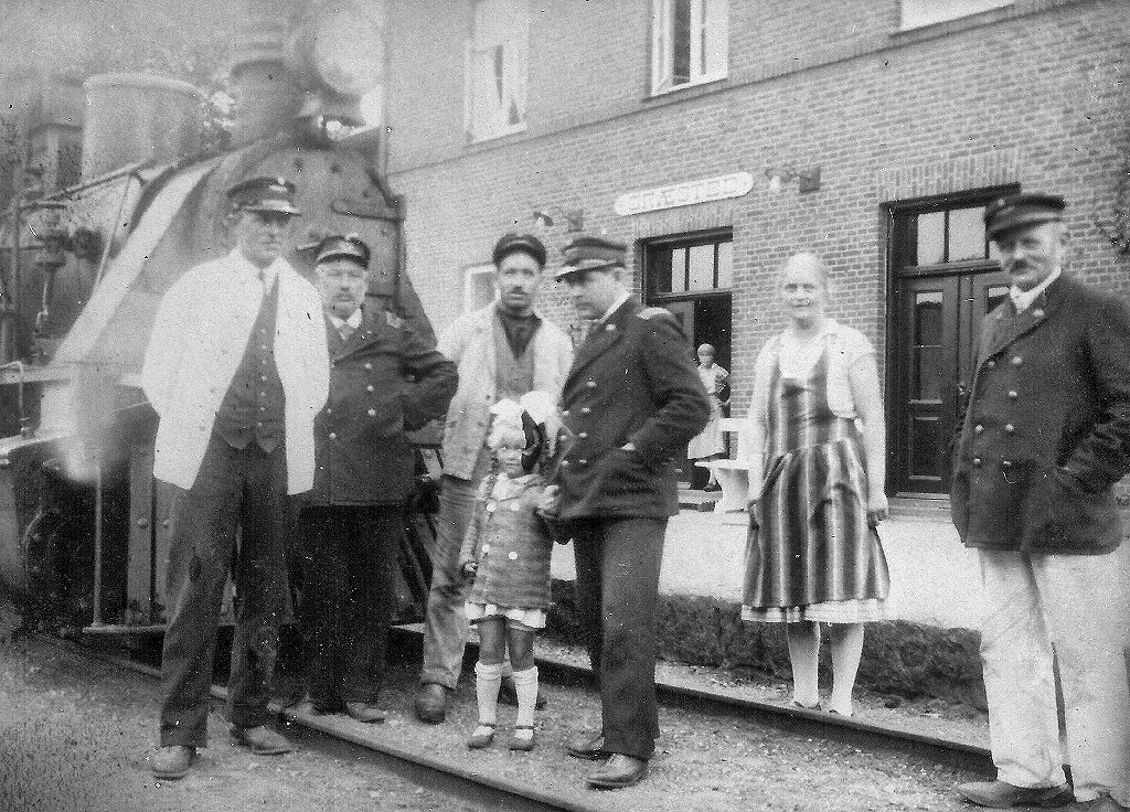 Personale fra Gribskovbanen foran lokomotivet, Græsted Station, ca. 1930