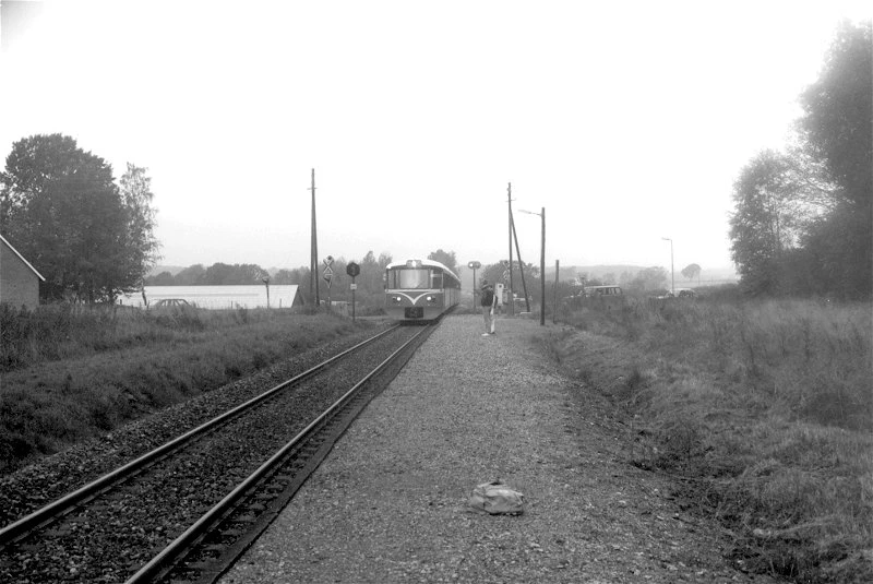 Duemose trinbræt ca. 1970 med ankommende 3-vogns Y-tog fra Tisvildeleje. Foto: Gribskov Arkiv, ukendt fotograf.