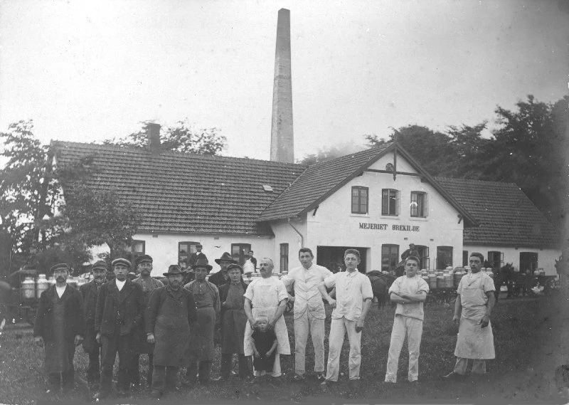 Ørekilde Andelsmejeri med mejerister og arbejdsfolk, ca. 1914. Mejeriet lukkede i 1962.Foto: Gribskov Arkiv. Ukendt fotograf.
