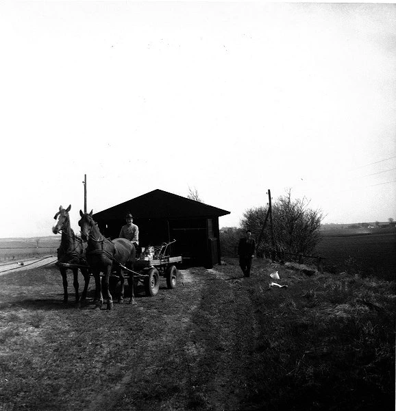 Hestevogn ved Ørby Station, set i retning mod Helsinge, ca. 1942. De to spor ses til venstre i billedet. Sidesporet blev brugt som læssespor for tørv fra Ellemosen og smørdritler fra Ørby Mejeri. Man havde også en kreaturfold til de dyr, der skulle fragtes med toget. Foto: Gribskov Arkiv, ukendt fotograf.