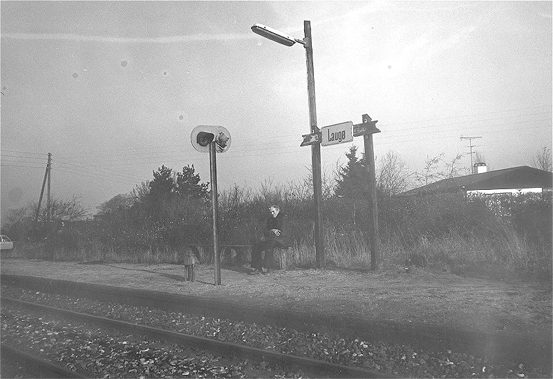 Laugø Trinbræt, omkring 1970. Det gamle skilt har fået påsat et nyt skilt med »Laugø«. Foto: Gribskov Arkiv. Ukendt fotograf.